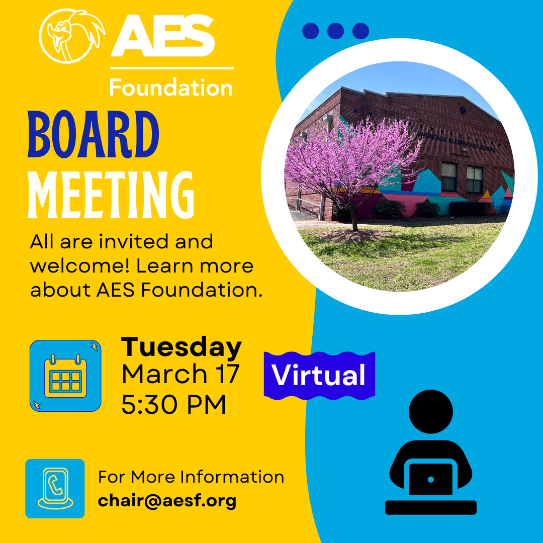 All are welcome! Join the AES Foundation for their bi-monthly board meeting on Tuesday, March 17. We will begin at 5:30pm. We will meet virtually. Please join our Zoom Meeting.