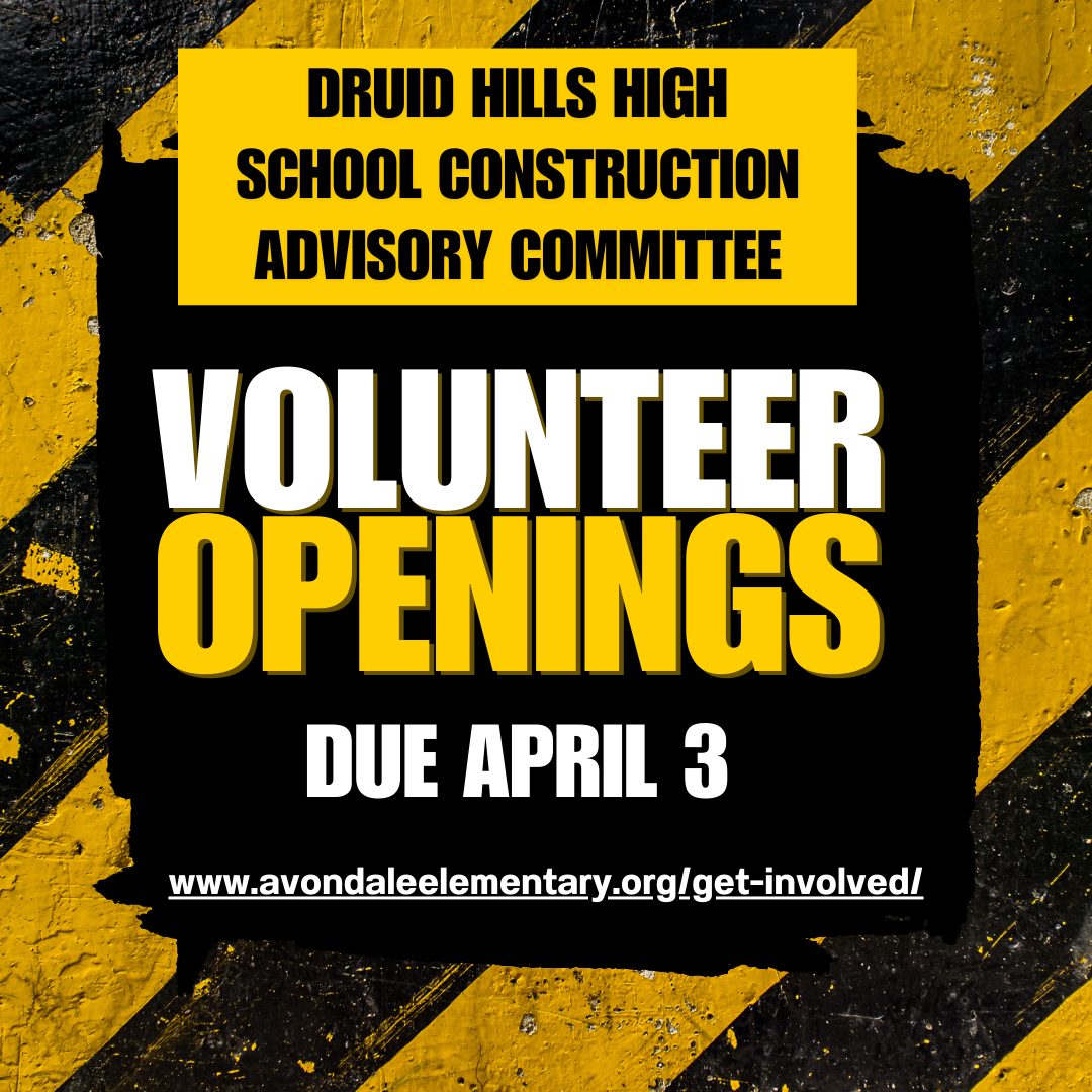The application deadline for the Druid Hills High School Construction Advisory Committee is April 3, 2026. Please click the link below to indicate your interest in serving on the committee. Access this announcement in multiple languages here.