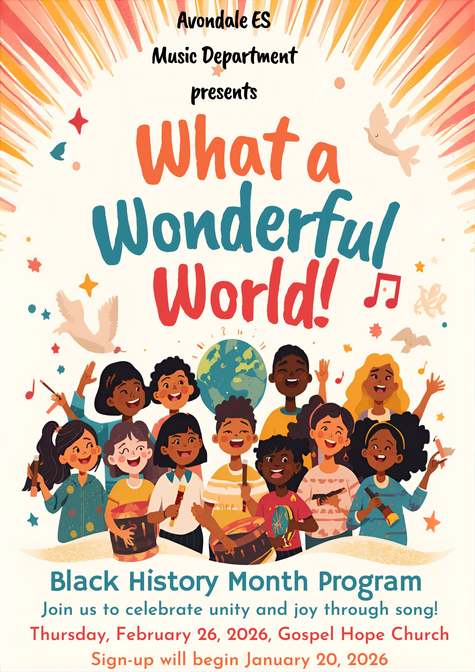 You’re invited to the AES Black History Program, “What A Wonderful World!” presented by the AES Music Department. Sign up to participate will begin on January 20.